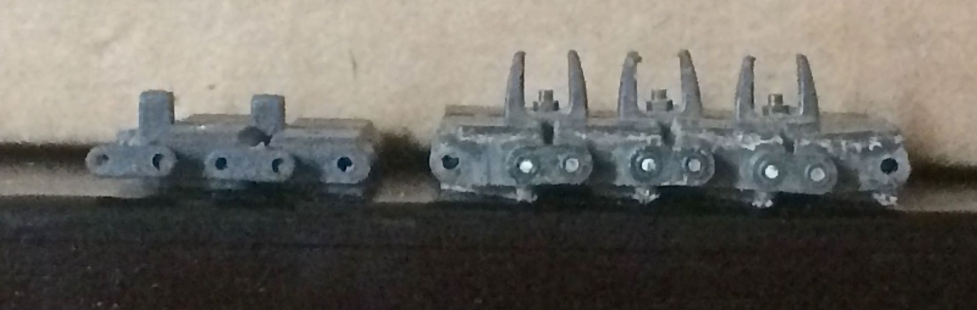 Hooben track on left, Tamiya track on right. Notice the difference in dimensional thickness of the track pads and link ends.
