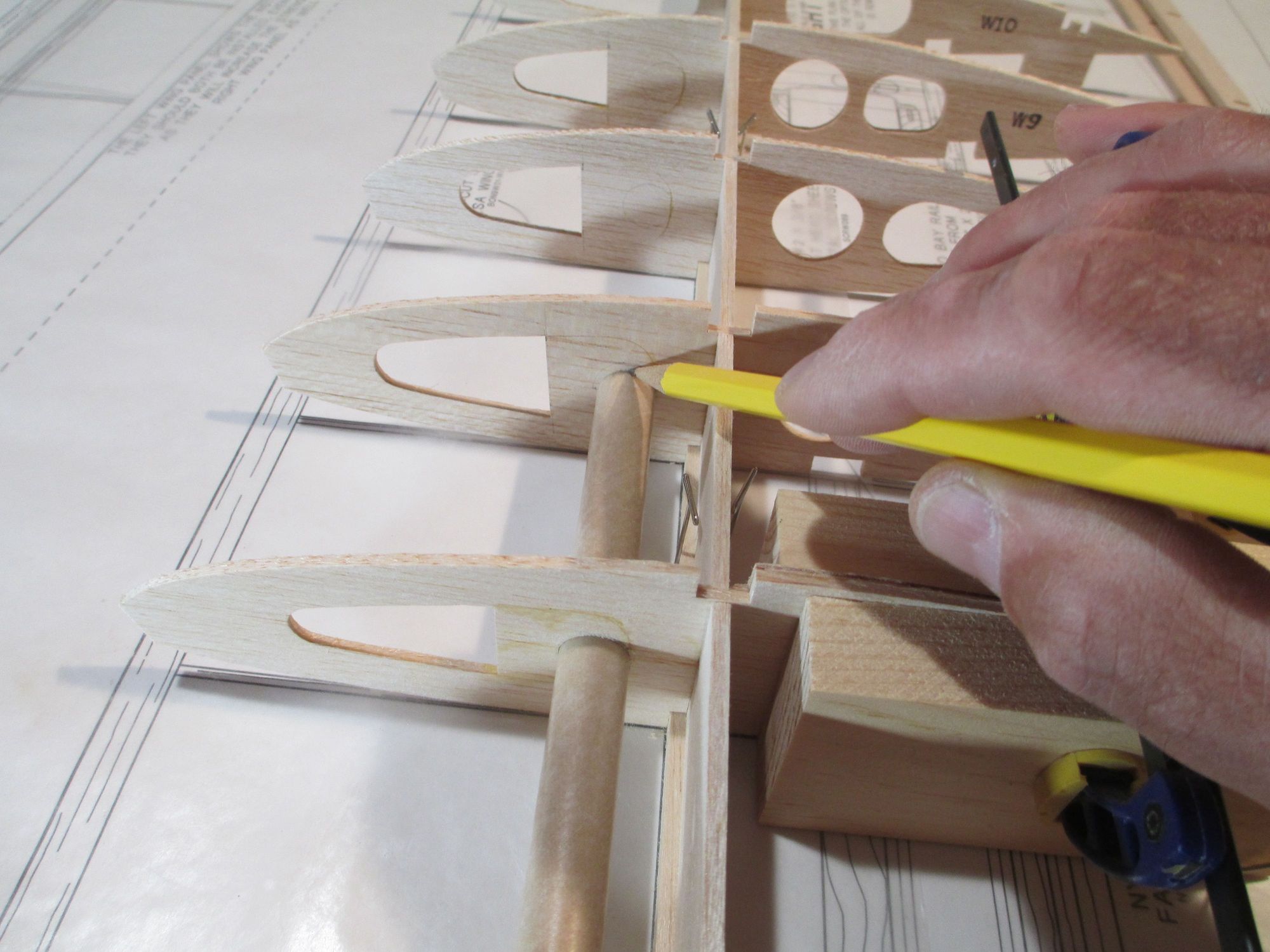 I didn't want to drill the holes oversize. I wanted the tubes to fit snug in each opening giving additional strength to each wing panel one epoxied in place. The tube is slid to the next rib in place and I simply draw an outline of the tube on the rib.