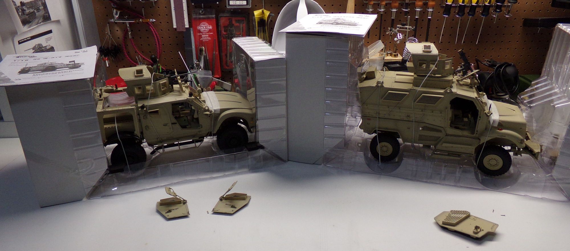 Just as they were removed from the retail packaging. The M-ATV doors were both broken off, the Maxxpro passenger door was off, and there was a small rectangular piece of plastic floating around in the M-ATV box. I didn't find out what it went to until later.