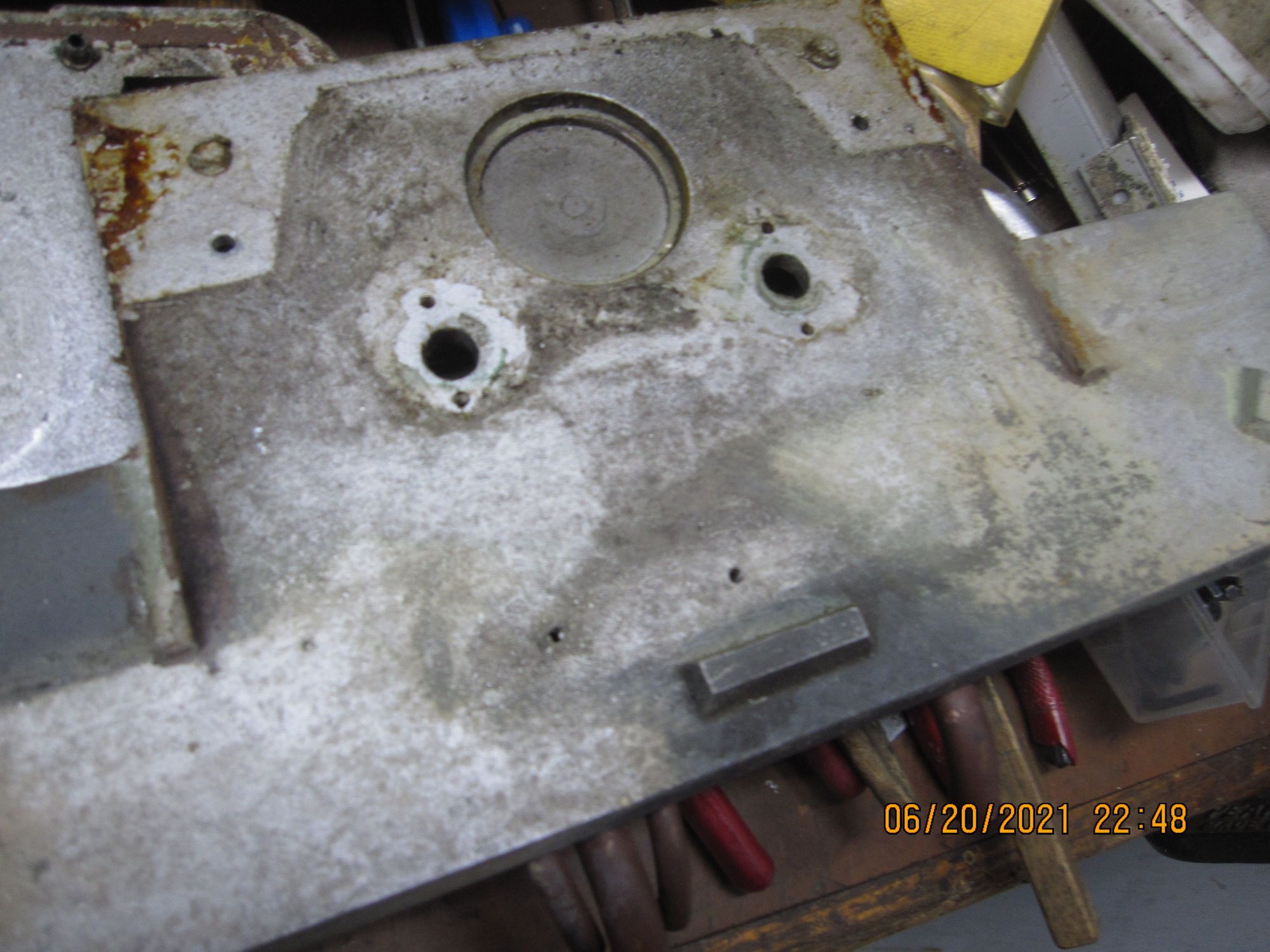 there were two enormous, odd, sort of irregularly countersunk holes on either side of the rear engine plate- here you may see the inner part in the different colored areas at the top of the photo.