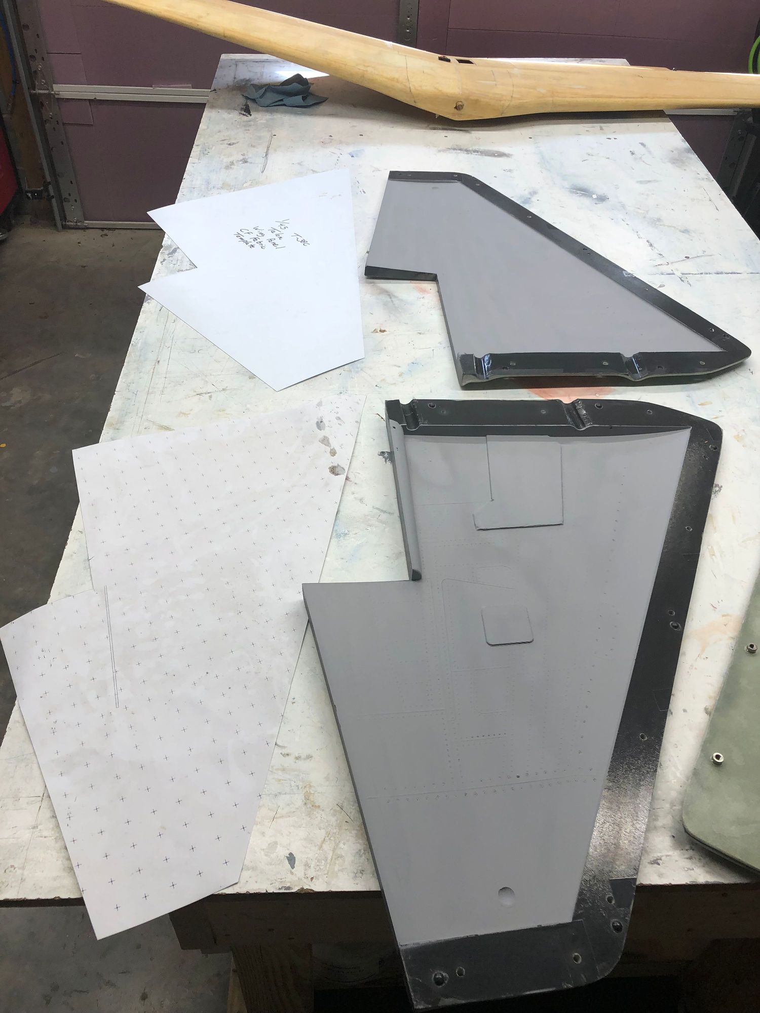 Paper airex core template is used for testing the fit prior to cutting the core from raw sheet on the laser cutter. A hard plastic template is made to simplify cutting out the carbon fiber layers of the wing panels. The fiberglass layers are cut on the laser cutter.