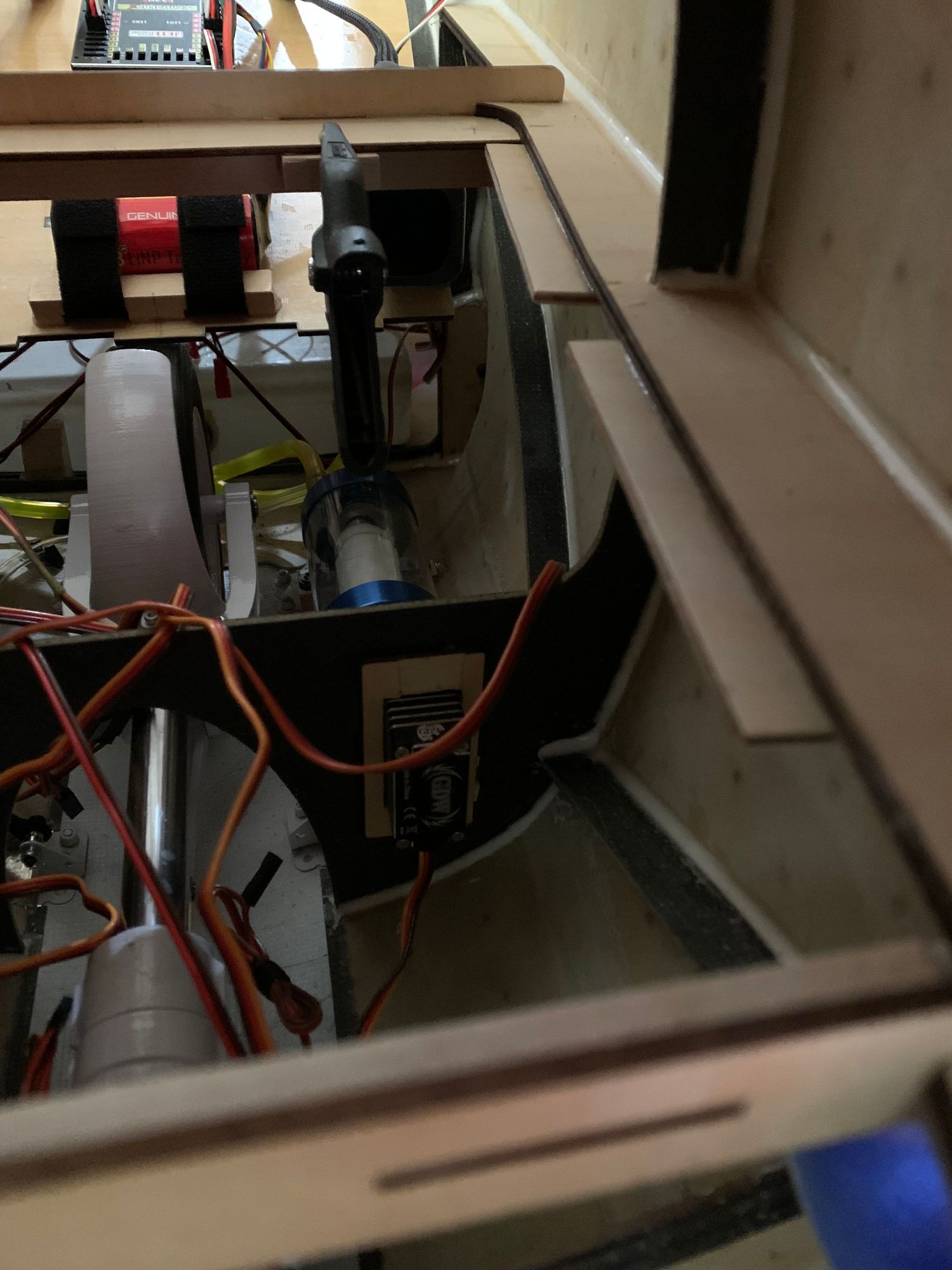 Plywood extensions to support electronic tray placed on both sides. Also used 3/8 x 1/2 inch hardwood supports glued horizontally under front and rear supports. To increase rigidity of the tray (gyro will be mounted on it) I fiberglassed the top of the tray with lightweight cloth and resin. Also added some reinforcement under the tray where gyro will sit to keep out any unwanted vibrations