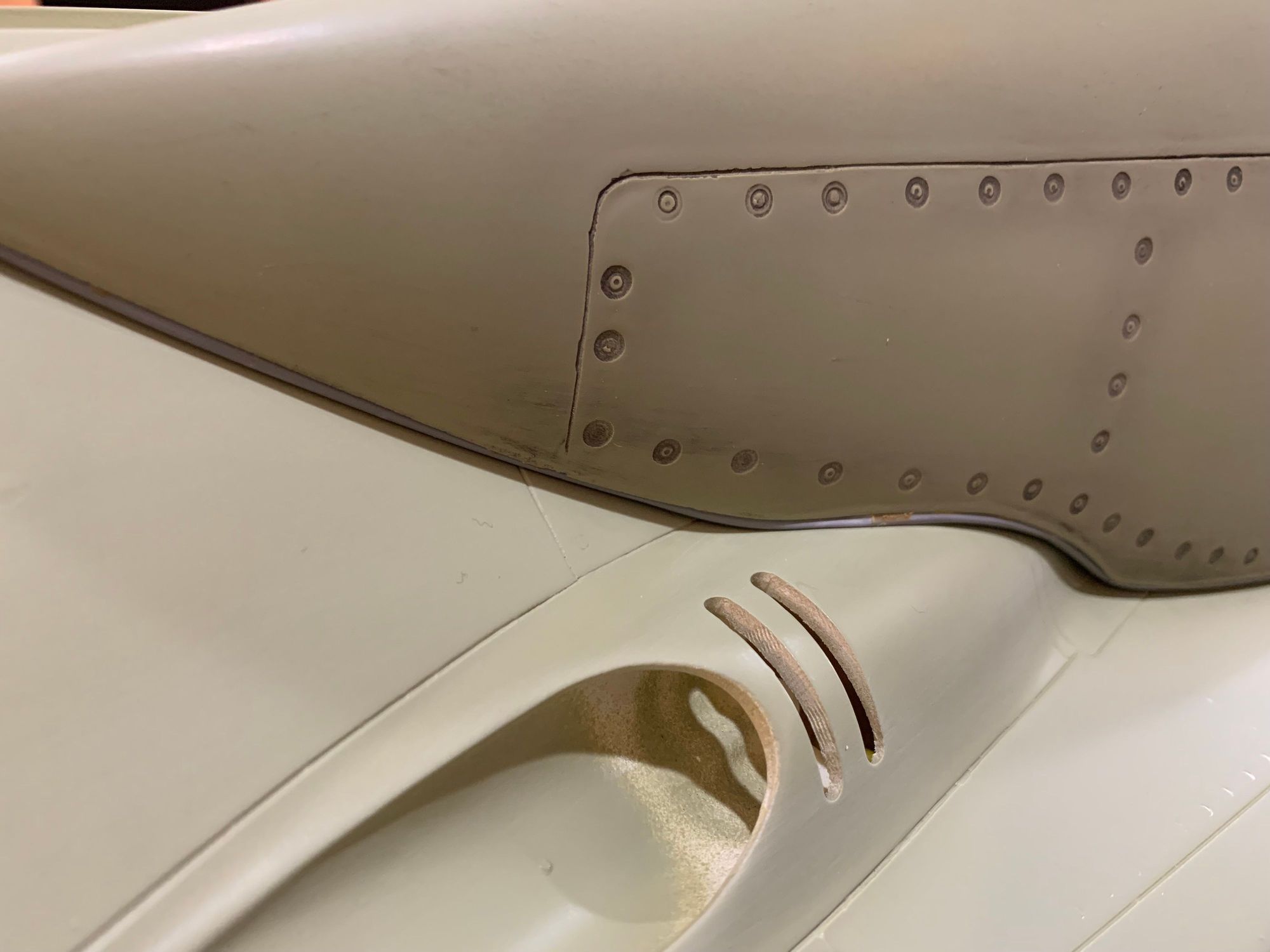 In the process of weathering the top fuselage and placing dry transfers. This photo shows the grey perimeter cushion that interfaces between the conformational fuel tanks and the fuselage. I used grey heat shrink tubing to mimic this and contact adhesive to glue the tubing to the conformational fuel tank. Looks very close to the full-size