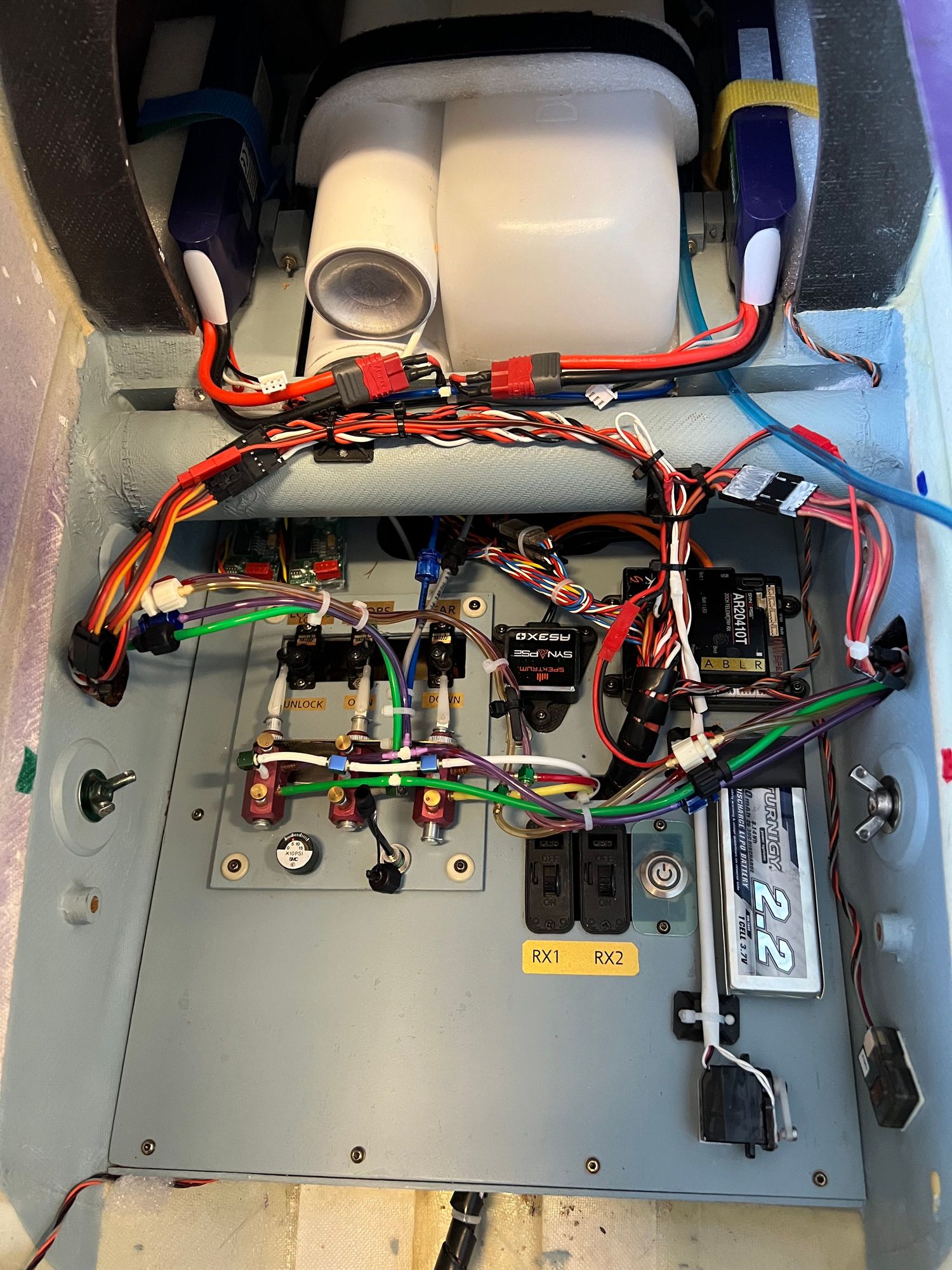 I mounted two super bright LEDs on the struts. They require a 1S lipo to operate. That's the batt you see lower right on the equipment tray. Behind the batt is the servo operated switch to the lights turn on and off. Once I see the locks are engaged I will turn them off to save the batt for lots of flights. I found I'd get about 30 minutes of lighting with them on steady so I'll have plenty of capacity even if I leave them on a lot.