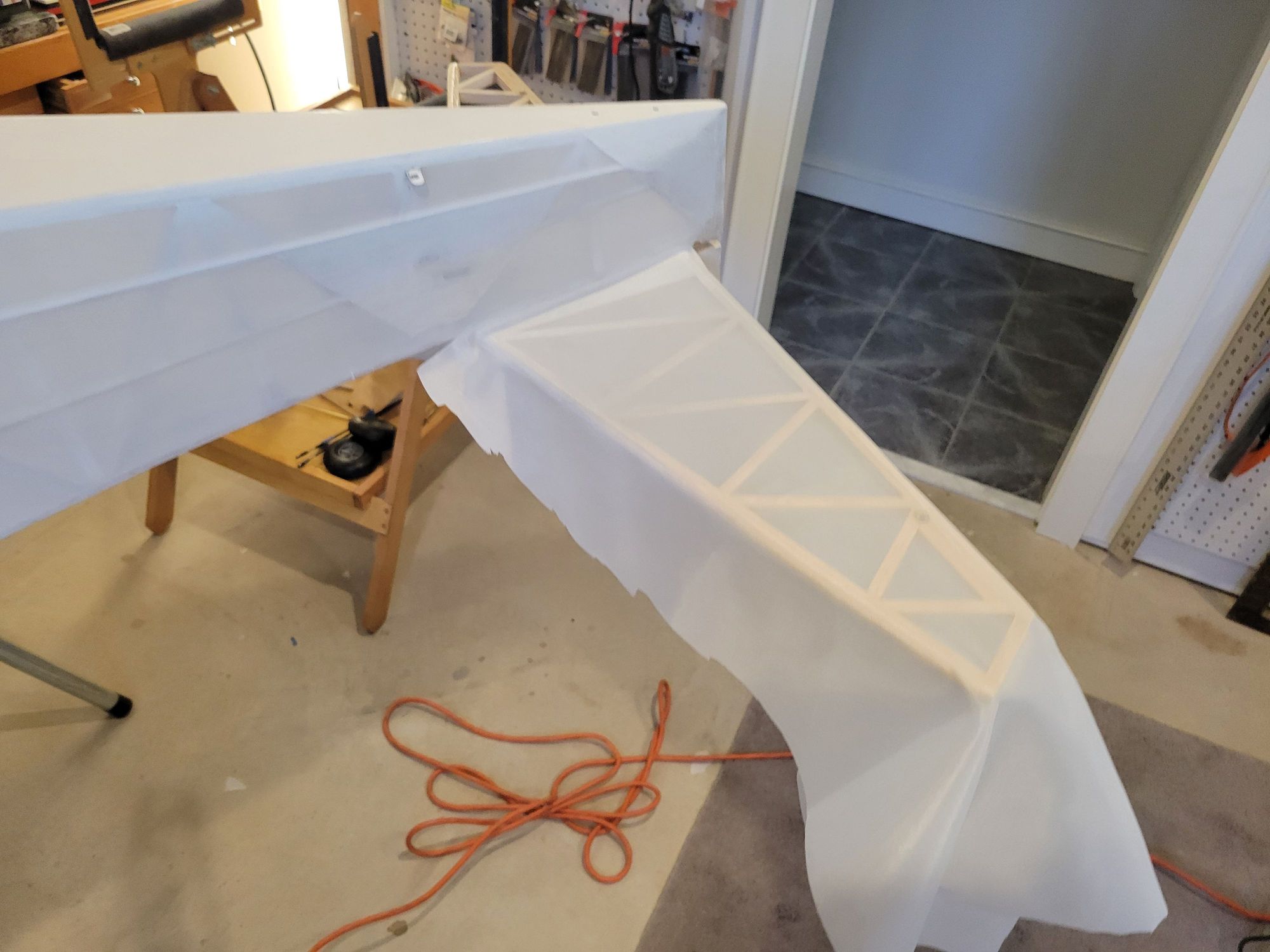 Last to cover are the horizontal stabilizers. I debated whether to cover the top and bottom in one piece, but I opted to cover them separately. Stix-it was brushed and the fabric was cut.
