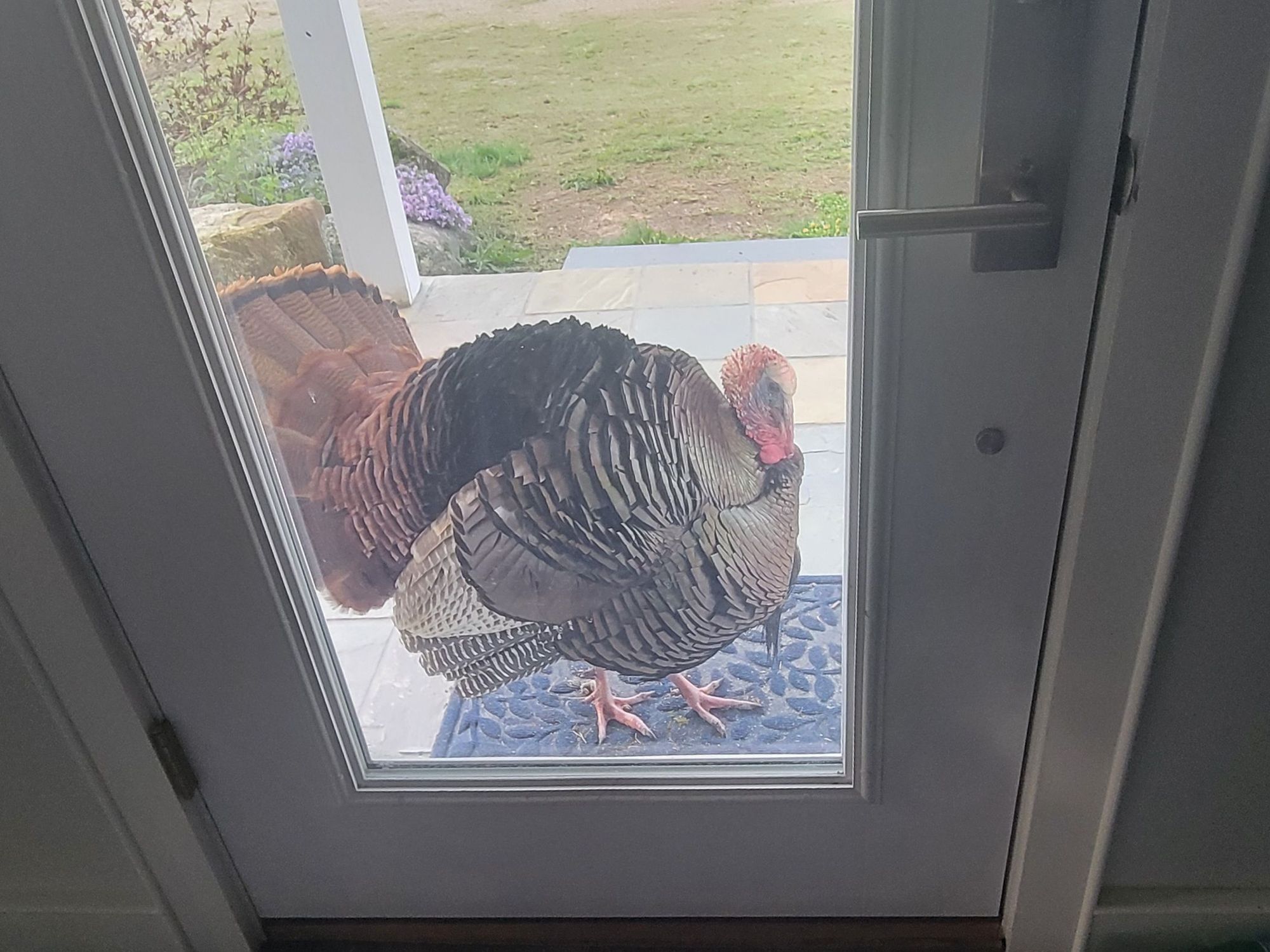 As I was mixing up some paint (5:30am) I heard this racket at the front door. What the heck, I can't make this stuff up...
